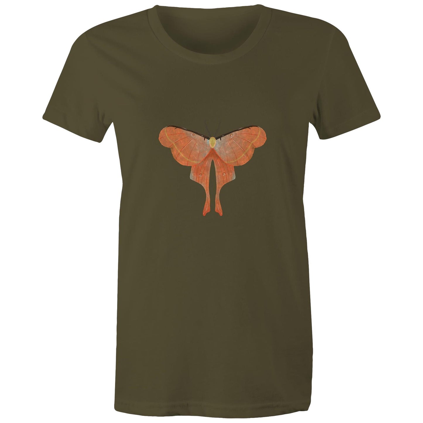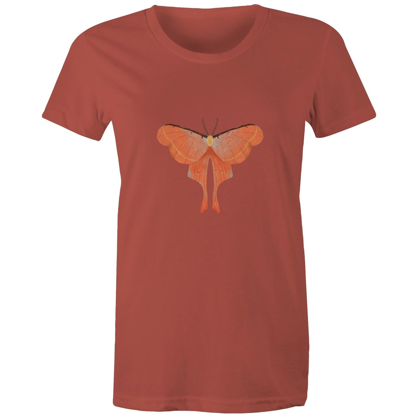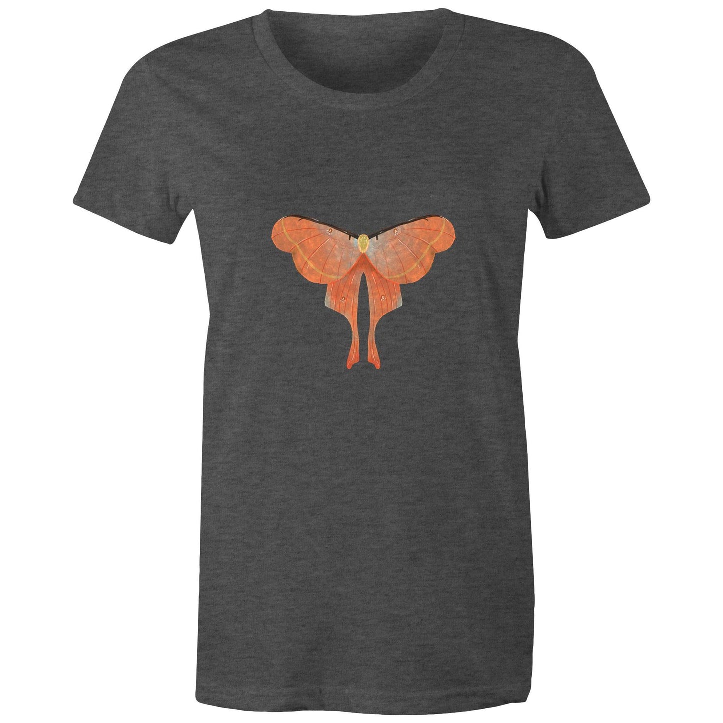 Womens orange moth printed t-shirt from Earthfolk.